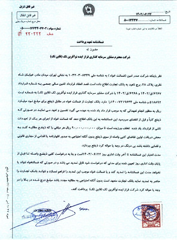 در زیر نمونه ای از ضمانت نامه تعهد پرداخت ارائه شده است.